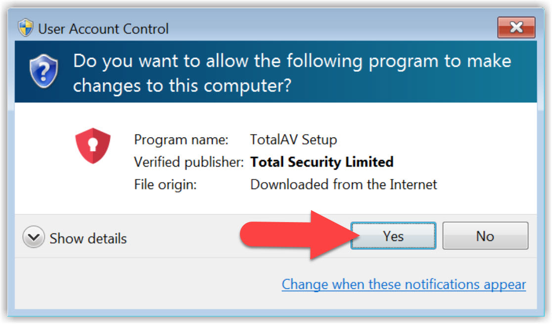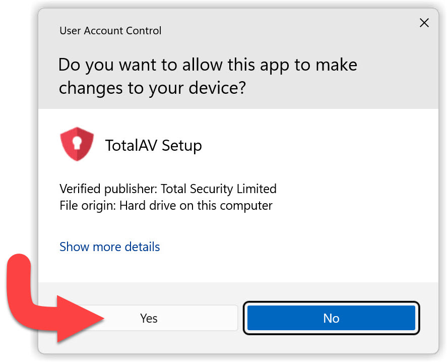 Klicka sedan på Ja för att tillåta att TotalAV påbörjar installationsprocessen. Utan godkännande kommer TotalAV inte att kunna installeras på din enhet.